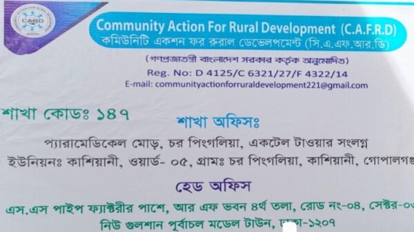 গোপালগঞ্জ জেলা প্রতিনিধি: গোপালগঞ্জের কাশিয়ানীতে গ্রাহকদের প্রায় ১০ লাখ টাকা নিয়ে কমিউনিটি একশন ফর রুরাল ডেভেলপমেন্ট(সি.এ.এফ.আর.ডি) নামে একটি ভুয়া এনজিও’র কর্মীরা উধাও হয়েছে বলে জানা গেছে। রবিবার ১০ আগস্ট গ্রাহকদের